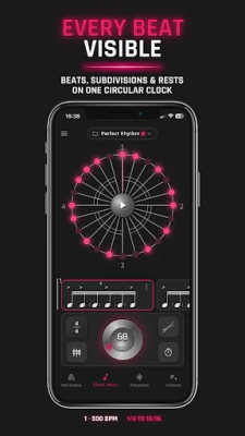 Metronome Lab inakuletea zana ya hali ya juu ya metronome, iliyosanifiwa kwa makini na wanamuziki, kwa wanamuziki. Bobea katika muda na mdundo wako kwa kutumia taswira yetu ya kipekee ya mdundo wa mviringo, vipengele vya kiwango cha kitaalamu, na kiolesura kinachoeleweka. Tofauti na metronome zingine, Metronome Lab hubadilisha mdundo kuwa uzoefu wa kuonekana, ikitumia muundo bunifu wa saa ya mviringo. Tazama kiashiria cha mdundo kikizunguka kwa ulaini, huku nukta na mistari vikionyesha kwa usahihi kila noti inapoanguka—hata mapumziko yanaonekana, jambo linaloharakisha uelewa wako wa kina wa mdundo.